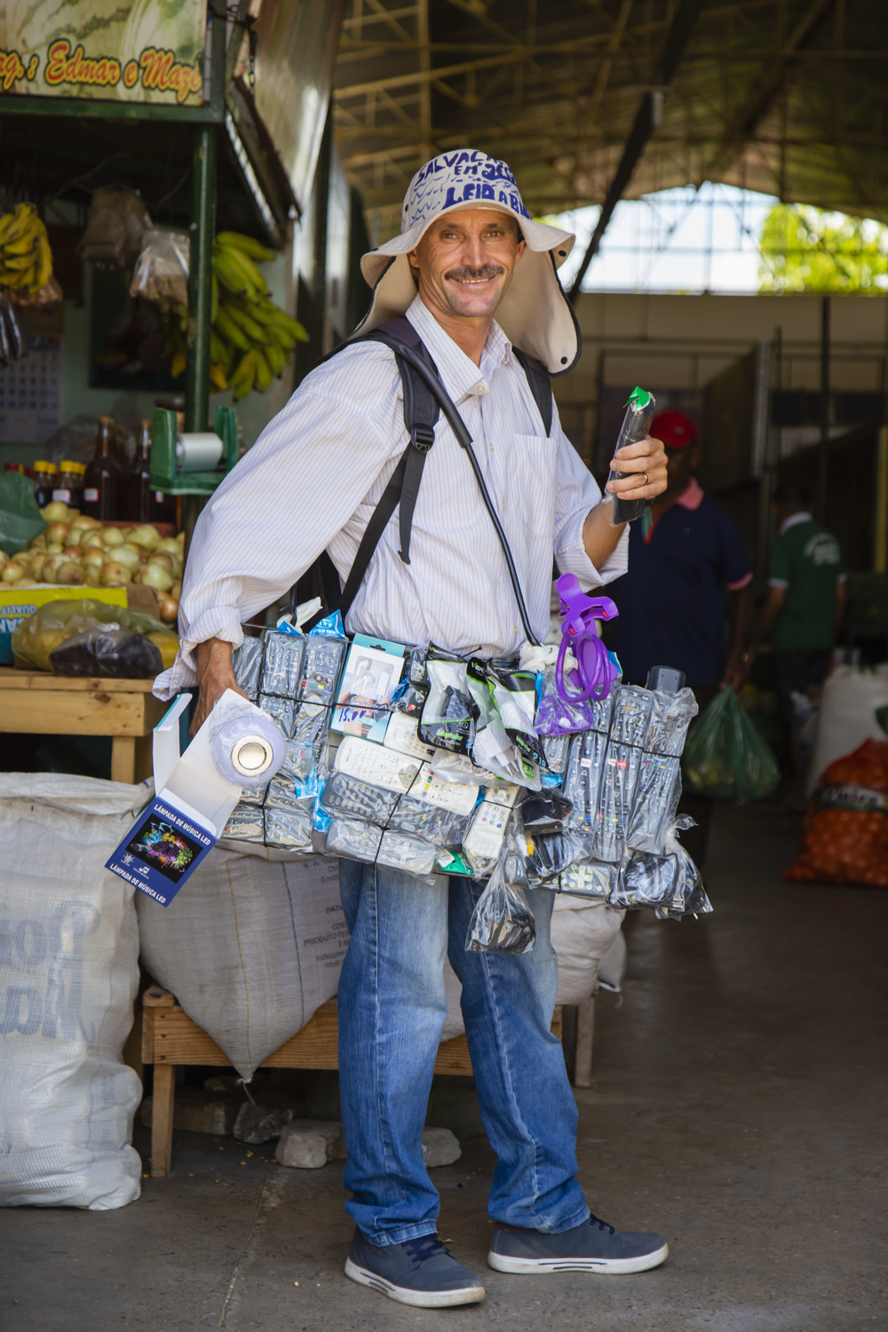 “Eu vendo é tudo. Se tiver sem controle, só Deus. “A gente tem os ‘abajus’, mas se tiver sem luz, só Jesus”, graceja. “E as lâmpadas com bluetooth pra botar no celular, vem até com FM para a rádio escutar.” Naquele dia escaldante, como costumam ser as manhãs de Russas nessa época do ano, Cícero tinha vendido pouco, de modo que pediu licença e retomou o passo apressado debaixo de sol. Antes, perambulou pelos corredores do mercado de frutas da cidade, um galpão de poucos metros quadrados abarrotado de cajus, bananas e doces, mercadoria escassa quando a comissão chegou à cidade.